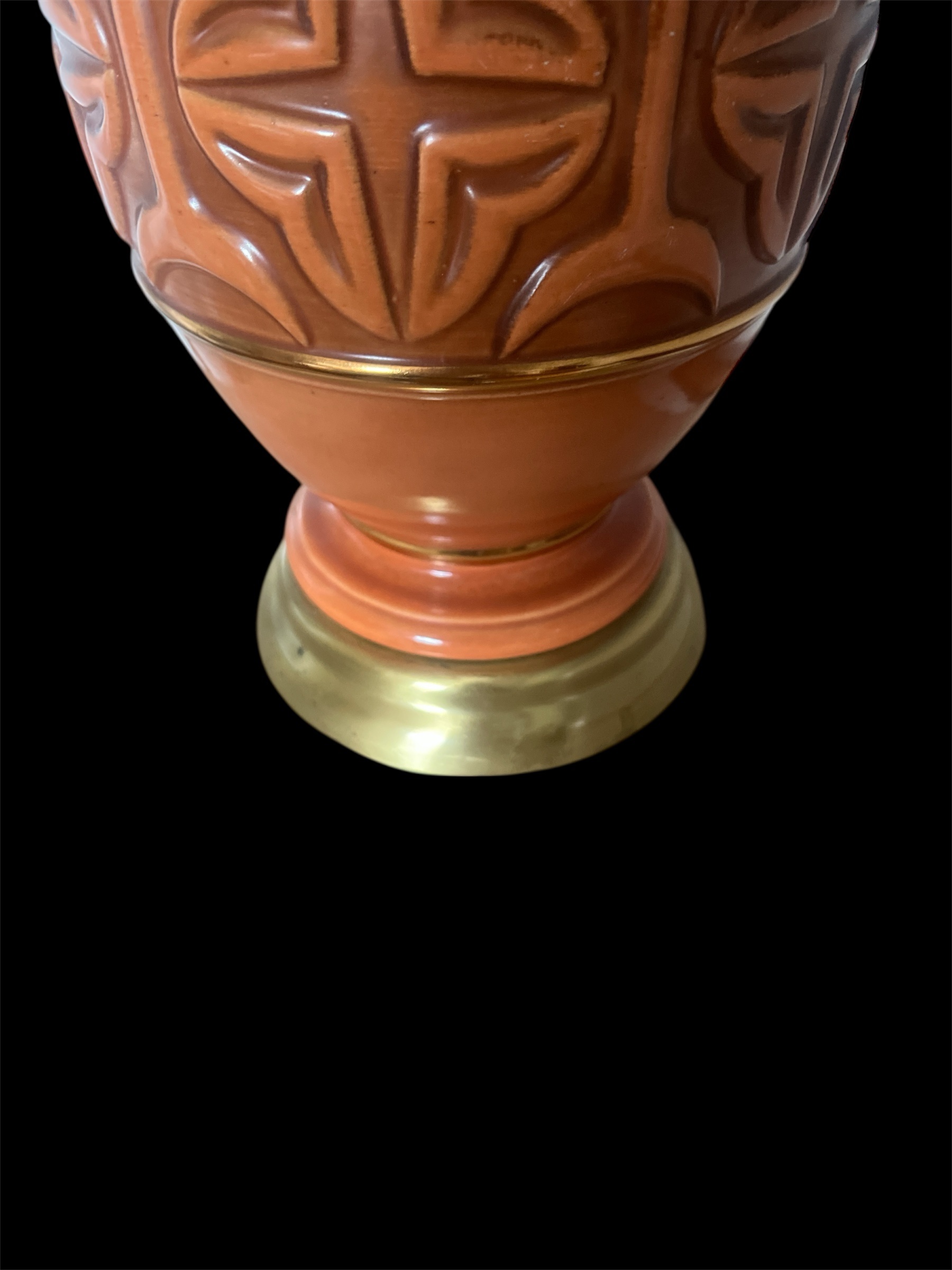 Add a touch of mid-century charm to your home with this striking vintage ceramic table lamp. Featuring a rich terracotta glaze and raised geometric motif, this lamp perfectly captures the warm, textured style of the 1960s. The brass base and trim add a subtle touch of elegance, balancing earthy tones with a refined metallic finish.