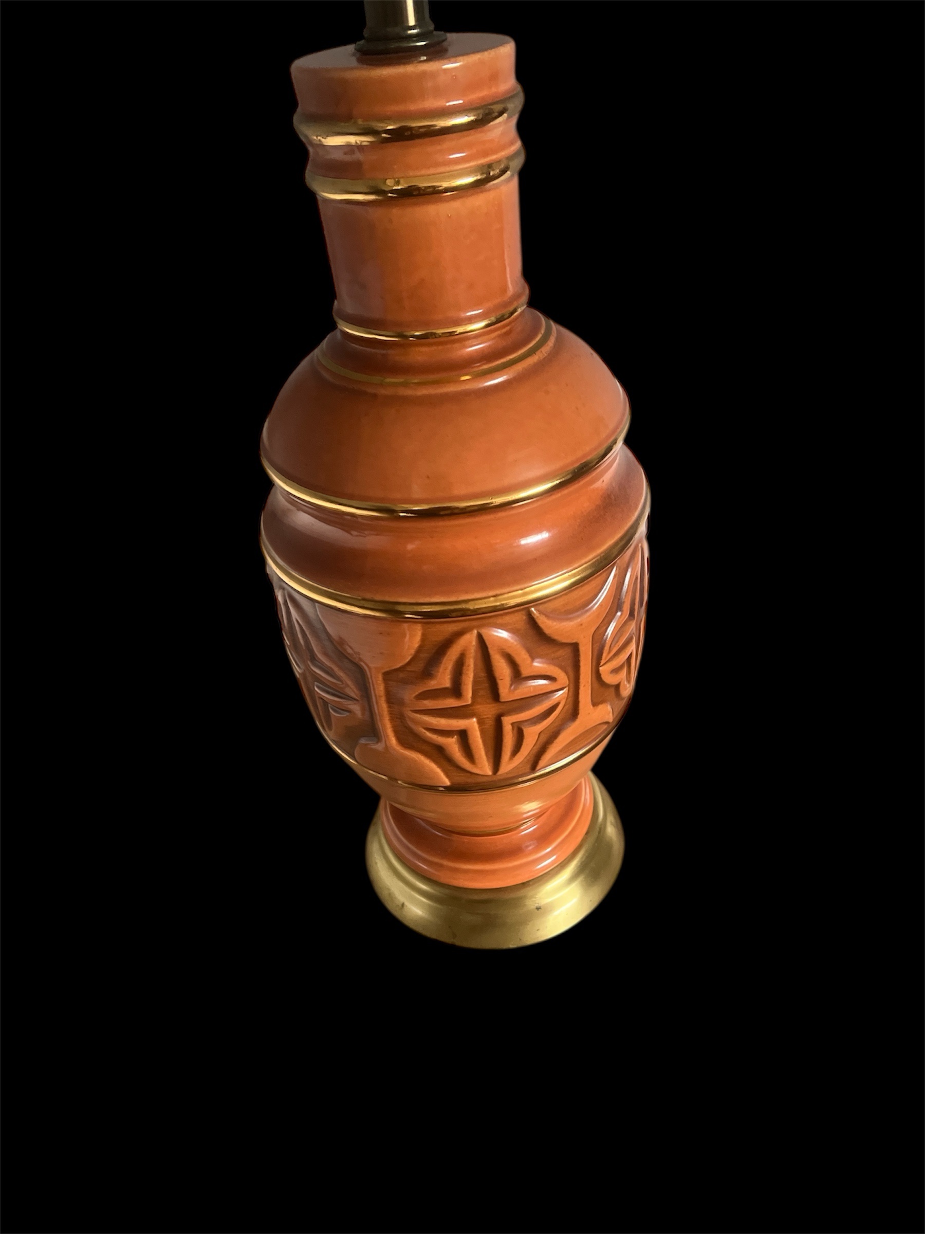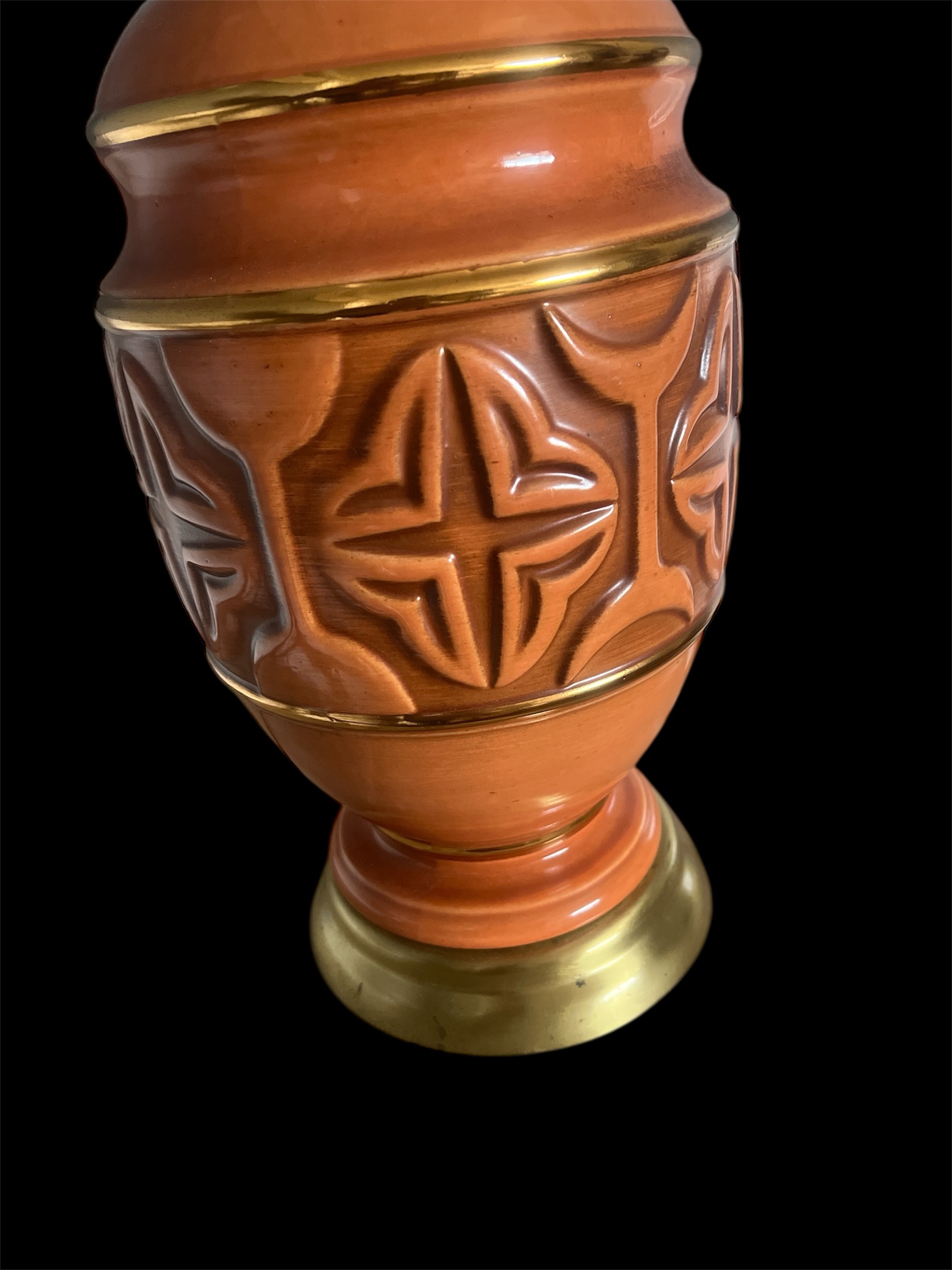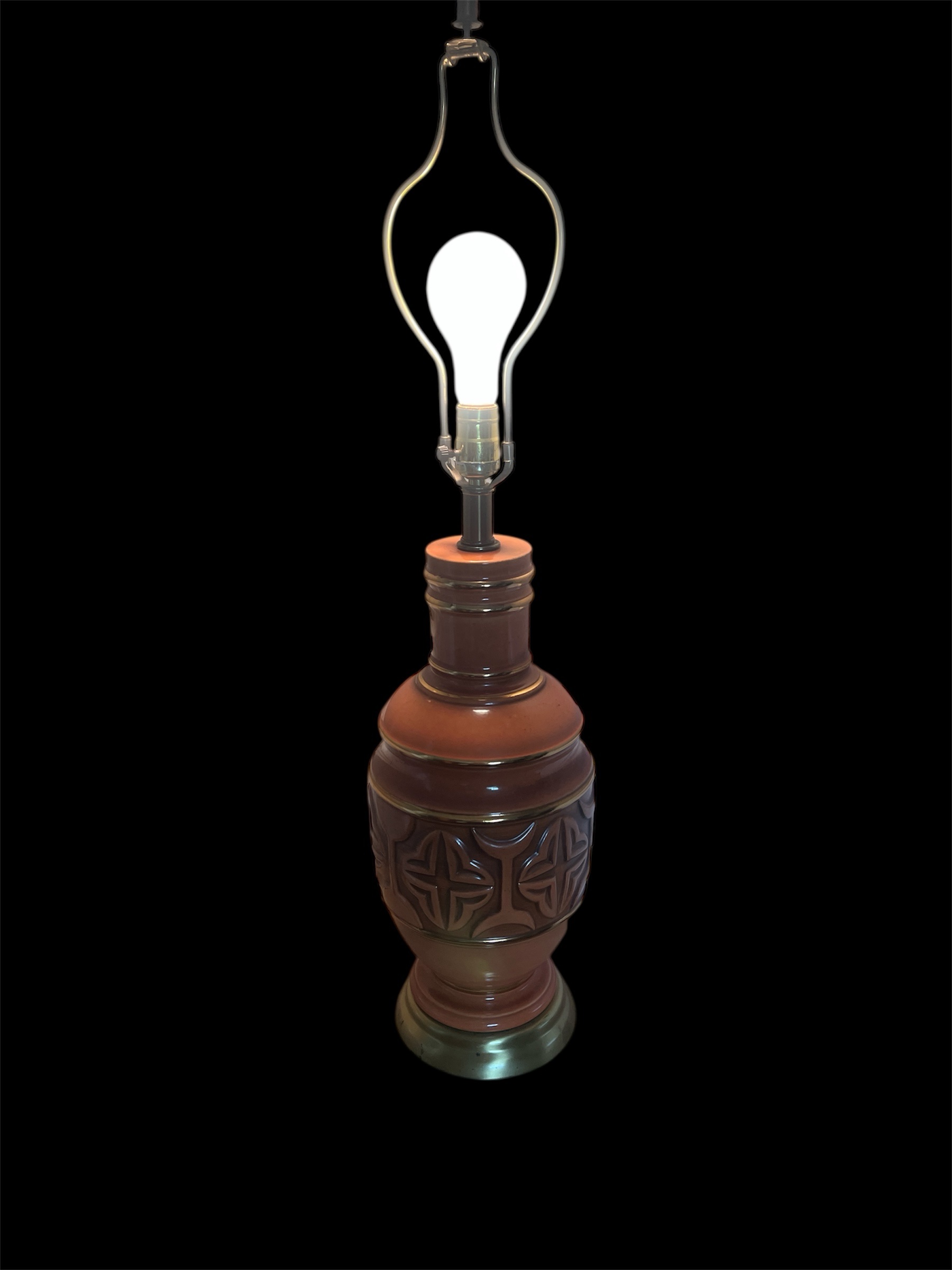 Add a touch of mid-century charm to your home with this striking vintage ceramic table lamp. Featuring a rich terracotta glaze and raised geometric motif, this lamp perfectly captures the warm, textured style of the 1960s. The brass base and trim add a subtle touch of elegance, balancing earthy tones with a refined metallic finish.